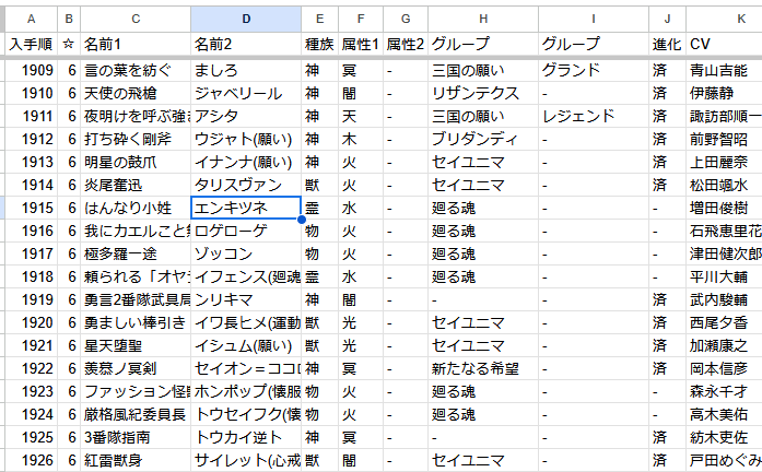 そういやさ。5.5周年のイベントでご担当者の方から、数体のキャラクターの名前の由来を教えてもらったりしてね。一覧作っているときに「面白い名前だなぁ」って思ったものとか、ググったりしてたのよ。それの答え合わせを期せずしてできて、一覧作ってて良かったなぁと思った瞬間だったんだ。全キャラの由来とか知りたい。すごぉい知りたい。
